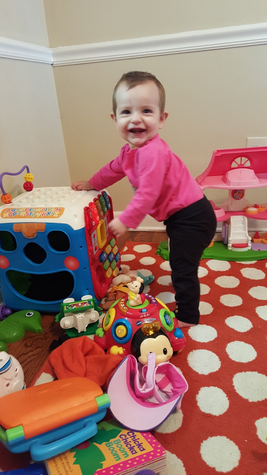 We aren't potty training yet, even though I'm pretty sure she's ready. She asks all the time to go potty. But, with it being the holidays, and we are always on the go.. we are waiting until January to commit to potty training. Lazy parenting? Most definitely. WE just aren't ready for that kind of commitment yet. She is still in her crib. I guess they say to keep them in until they try to climb out? Well, we haven't run into that issue yet. So, we will keep her contained until we can't any longer.